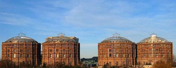 When Vienna converted its energy supply from town gas to natural gas in the 1970s, its massive gasometers become obsolete. The Vienna gasometers are four huge gas tanks, built between 1896-1899 in the 11th district of Simmering. Each of these gas holders had a storage capacity of 90,000 m³ and at the time, the Vienna gasometers were the largest gas plant in Europe, supplying town gas to the citizens of Vienna from 1899 to 1984.