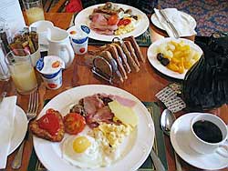 Personally, I prefer the continental approach, but you will still get a full English Breakfast served to you in most UK hotels. Usually, this will consist of fried bacon and egg, mushrooms, sausage, grilled tomatoes, fried bread and, especially in the north, black pudding (blood sausage). It was also traditional to serve grilled kippers (salty, oak-smoked herrings), but this is more rarely found nowadays. These dishes will be accompanied with white toast, butter and marmalade (Frank Cooper Vintage Oxford or the original Keiller Dundee Marmalade are best) and of course, tea with milk.