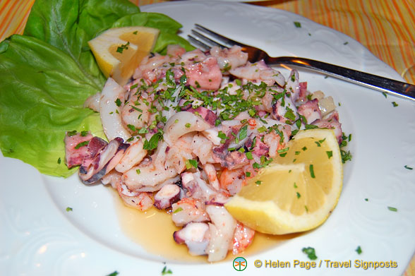 For entrée, I order the Anti-pasto Misto Mare which is made up of chopped octopus and prawns with lots of herbs, which is quite tasty . Tony orders the Stuffed Anchovy, but unfortunately has to send it back. The dish looks good but it turns out that there’s minced mortadela ham in the stuffing. To get a quick replacement entrée Tony opts for a Salad Caprese.